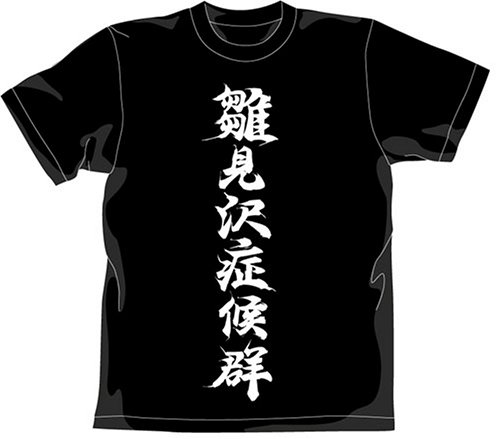 「ひぐらしのなく頃に」より、「雛見沢症候群」とプリントされたTシャツ。バックには狂気の表情のレナもプリントされている。